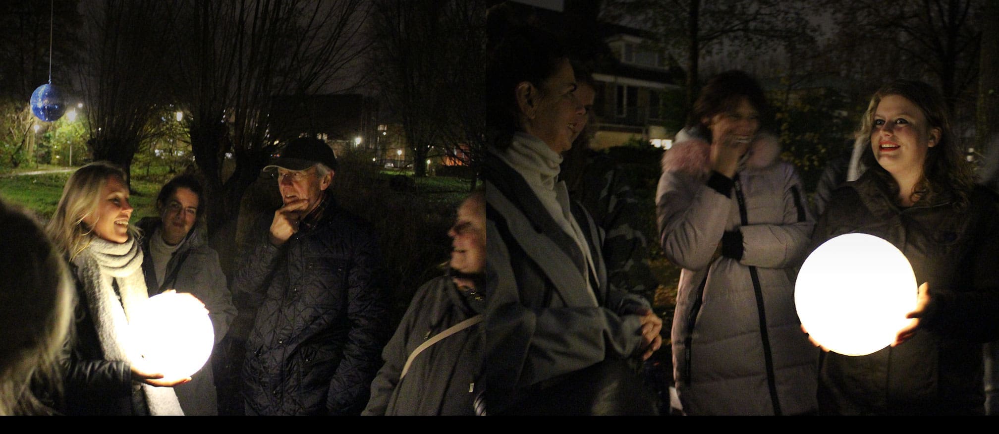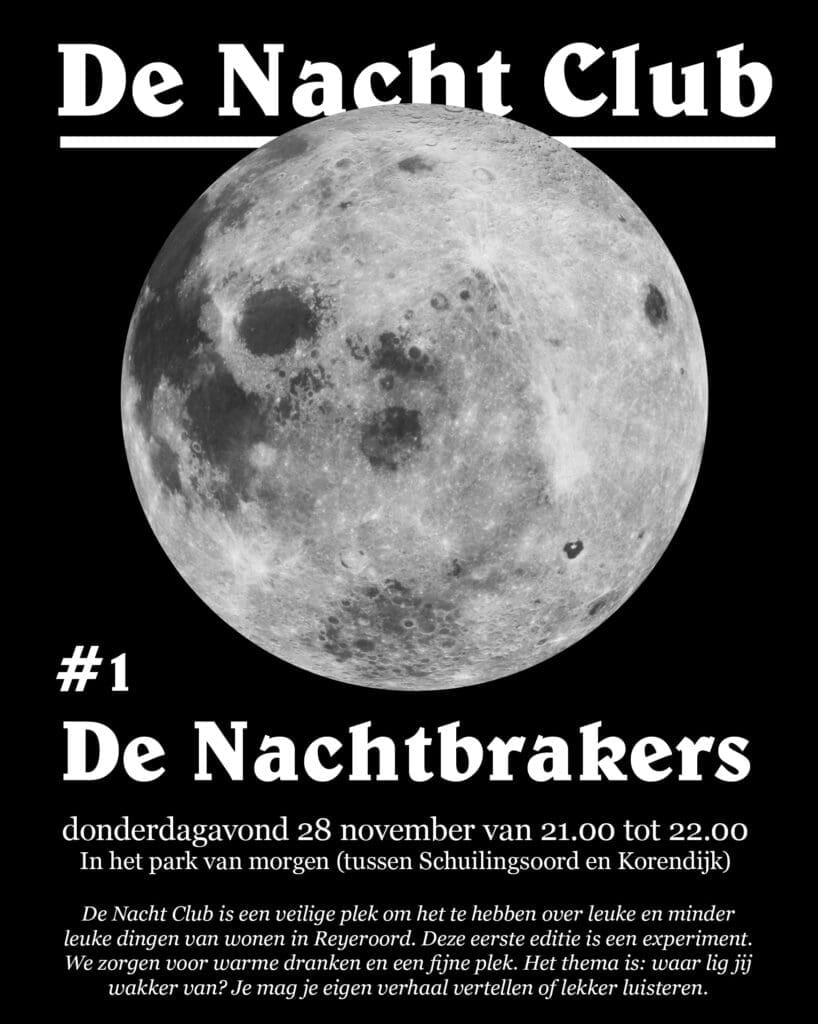 Tijdens De Nacht Club #1 kwamen we samen op een plek die bewoners normaal liever mijden in de nacht. Een donker stukje park licht op onder een discobol. Zowel bewoners als wijkagent Mark zien hoe de groenstroken leeg worden als de avond valt. Rondjes met de hond worden korter. Maar als we elkaar verhalen vertellen merken we dat velen er een nachtleven op na houden of hielden. Van nachtritten door Europa tot betrapt worden door een boze -ex. Maar ook een incident met een mes, in de wijk. Toch groeit het besef: hoe veilig het is, bepalen we grotendeels zelf.