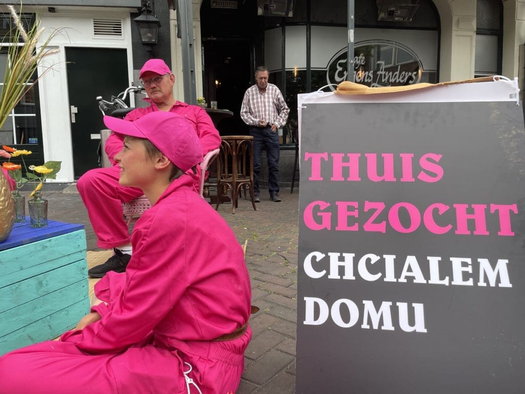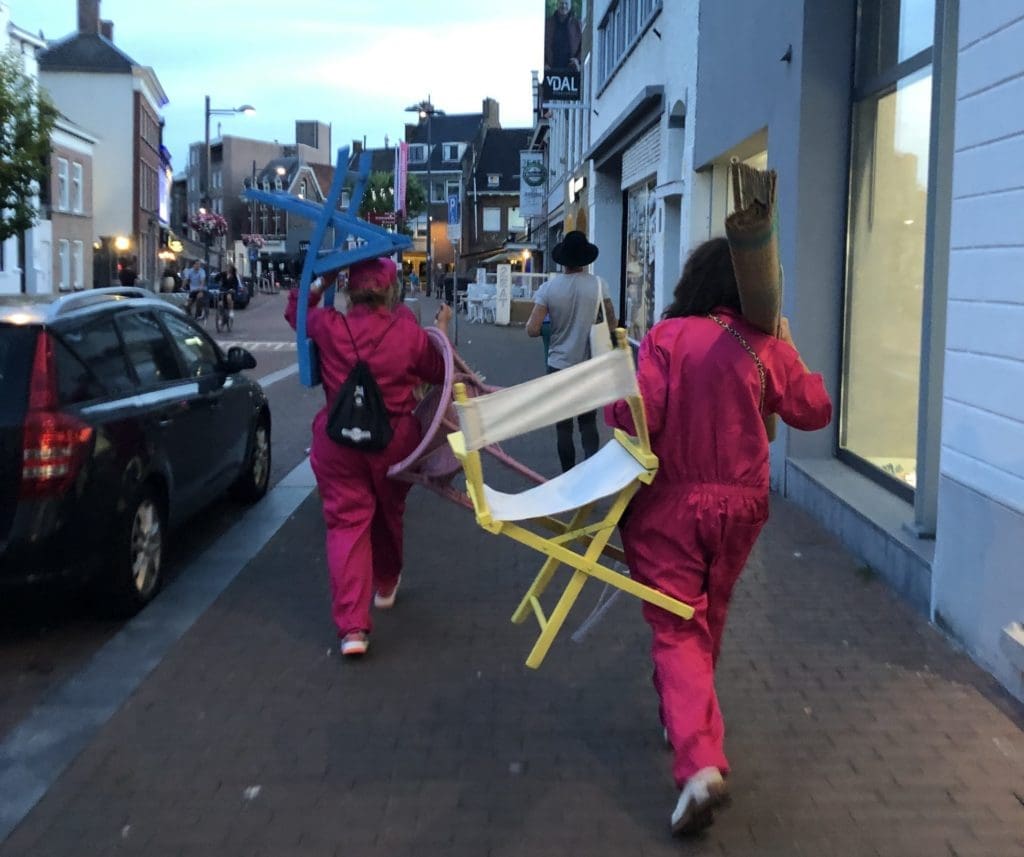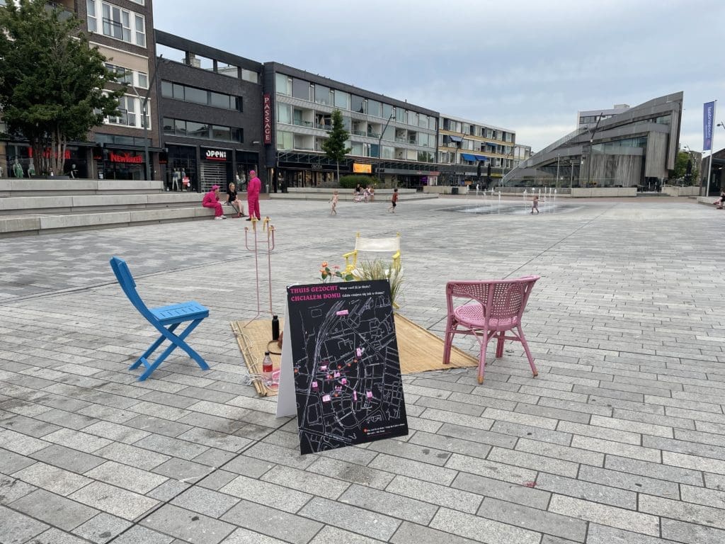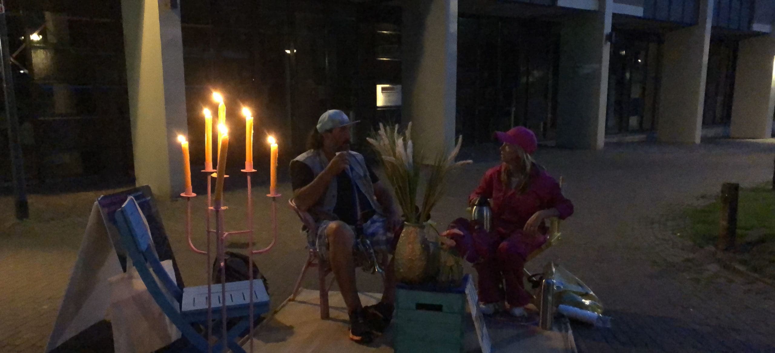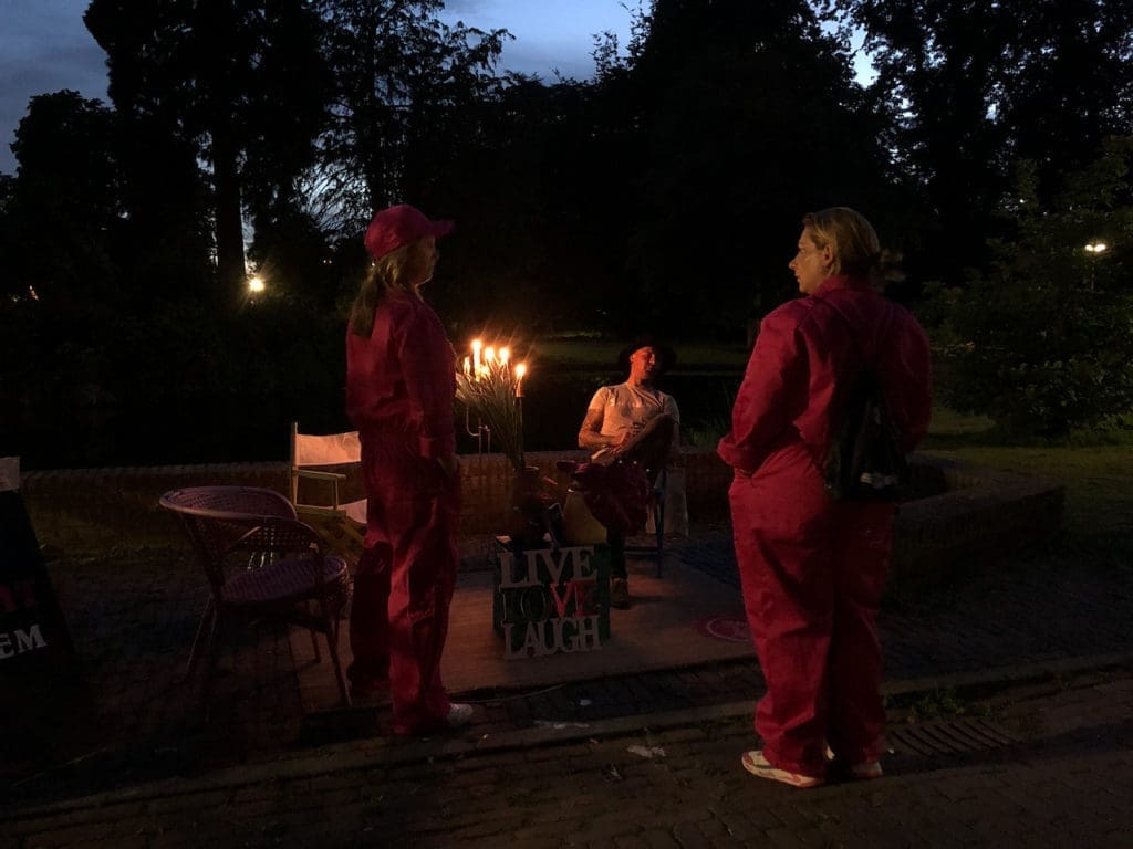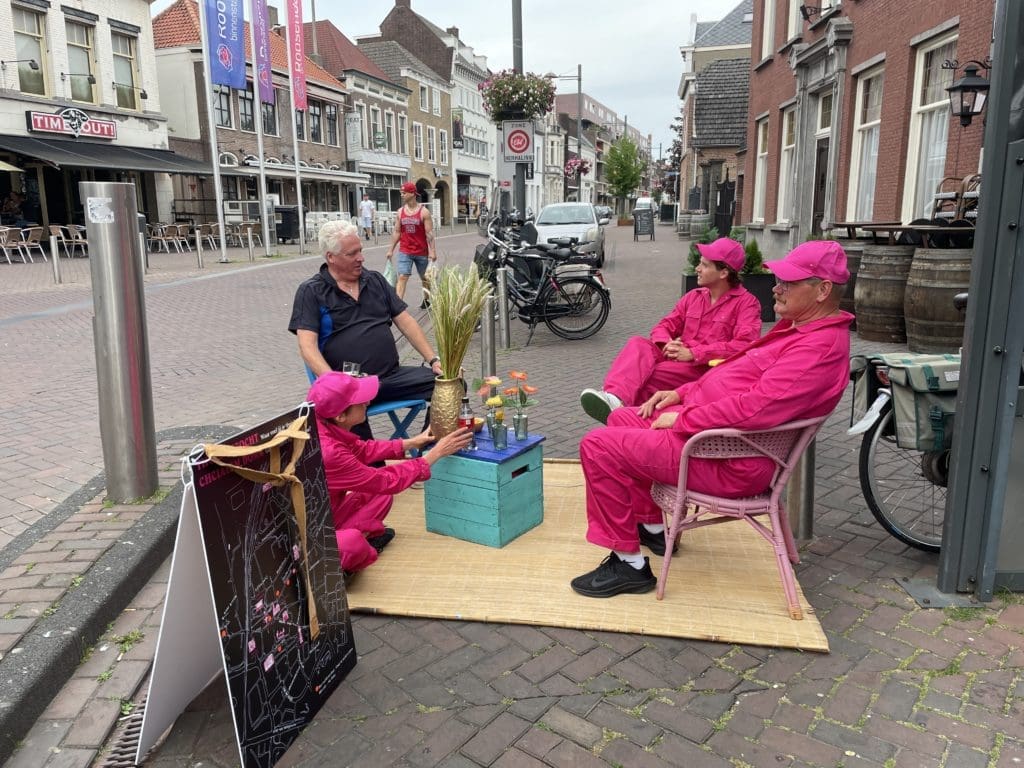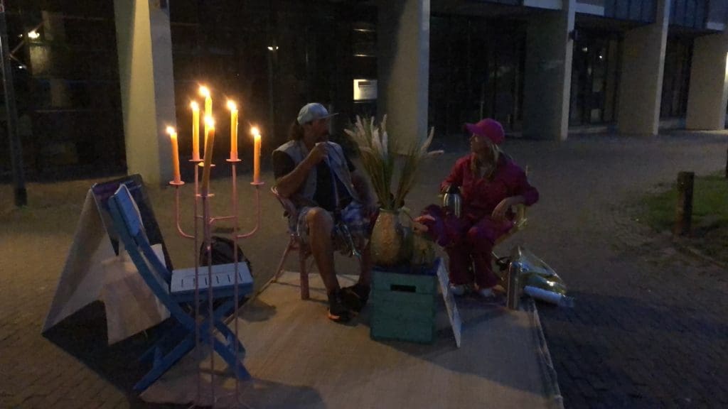 ‘Heb je die mensen in de roze pakken al gezien?!” Roept een jongen terwijl hij wild aan komt rijden op een scooter in het Emile van Loonpark. Het is maandagavond, hij heeft hen zien sjouwen met huisraad, een kistje, een paar stoelen, kaarsen. Ze hebben een kleed uitgerold in het park. In de spontane huiskamer neemt de jongen plaats, zijn vrienden staan eromheen met scooters die veel lawaai maken. Ze zijn druk in gesprek, over thuisgevoel of het gebrek daaraan. Na een uur breekt de club op en verhuist verder, naar het pleintje voor het casino. Een man gaat op de stoel zitten met z’n blik bier. Hij vertelt over ‘het leven’ en dat hij geen huis heeft maar wel de enige officieel geregistreerde dakloze van Roosendaal is. Hij pakt zijn trompet en begint te spelen.