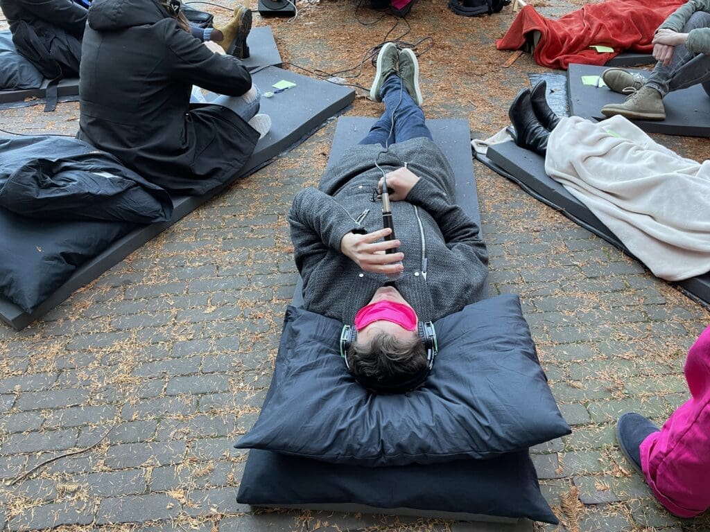 Op een matje, buiten in de kou, bril af, maar met slaapmasker op. Echt uit mijn comfortzone. Maar door het ongemak kwamen we toch eerder tot de kern van het gesprek en “hoef je niet al die officiële lagen af te pellen.”