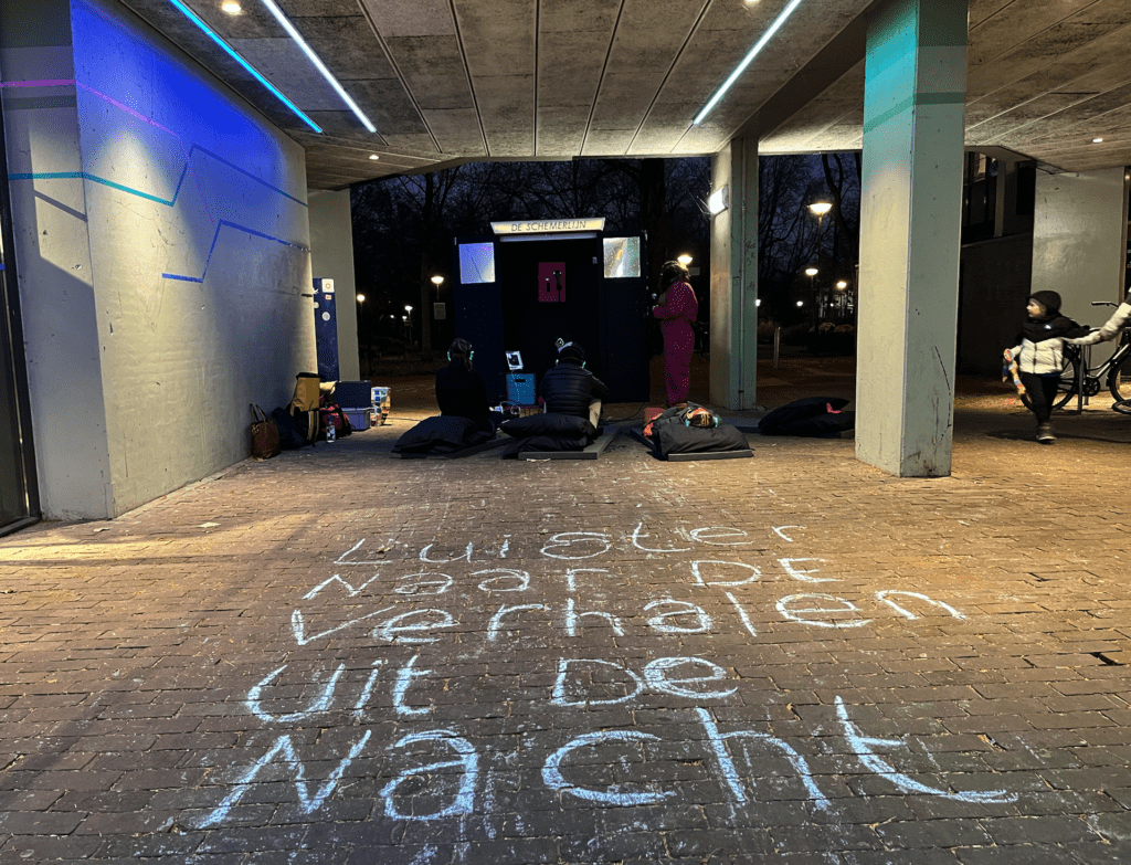 Begin december vertelt het team zelf de nachtverhalen die hen het meest hebben geraakt door aan collega professionals van beleid en uitvoering die werken bij gemeente en woningcorporatie. Zoals het verhaal over van een stel dat strandde op weg naar Parijs en niet binnengelaten werd in het hotel. Over de moeder en het kleine meisje dat op het station moesten slapen. En over een jongen die zei dat de drugsdealer eigenlijk de enige was die altijd tijd voor hem had. Ze doen dat overdag, maar in nachtelijke setting. Ze dagen collega’s uit om onderdeel te worden van hun ‘schemerclub’. In de Schemerclub leer je dat je niet altijd op systemen kunt vertrouwen. Soms is het bewolkt en kun je niet op de sterren varen, en dan heb je alleen je menselijke morele kompas. Wat betekent dit voor de manier waarop we (samen)werken?